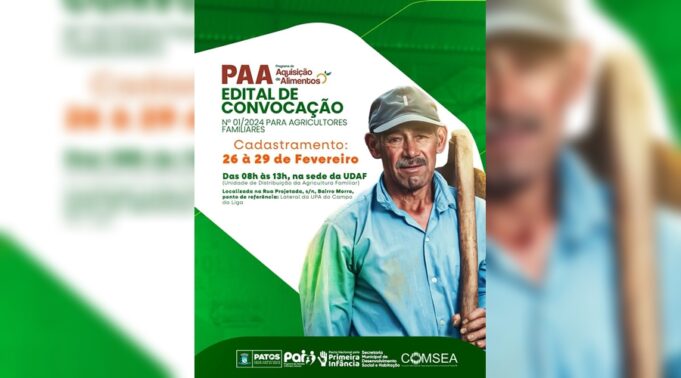A Prefeitura de Patos, por meio da Secretaria Municipal de Desenvolvimento Social e Habitação, anuncia lançamento do Edital 01/2024 para a participação no Programa de Aquisição de Alimentos (PAA). O programa, criado com o objetivo de promover o acesso à alimentação e incentivar a Agricultura Familiar, oferece oportunidades para agricultores familiares individuais e demais beneficiários que atendam aos requisitos estabelecidos.