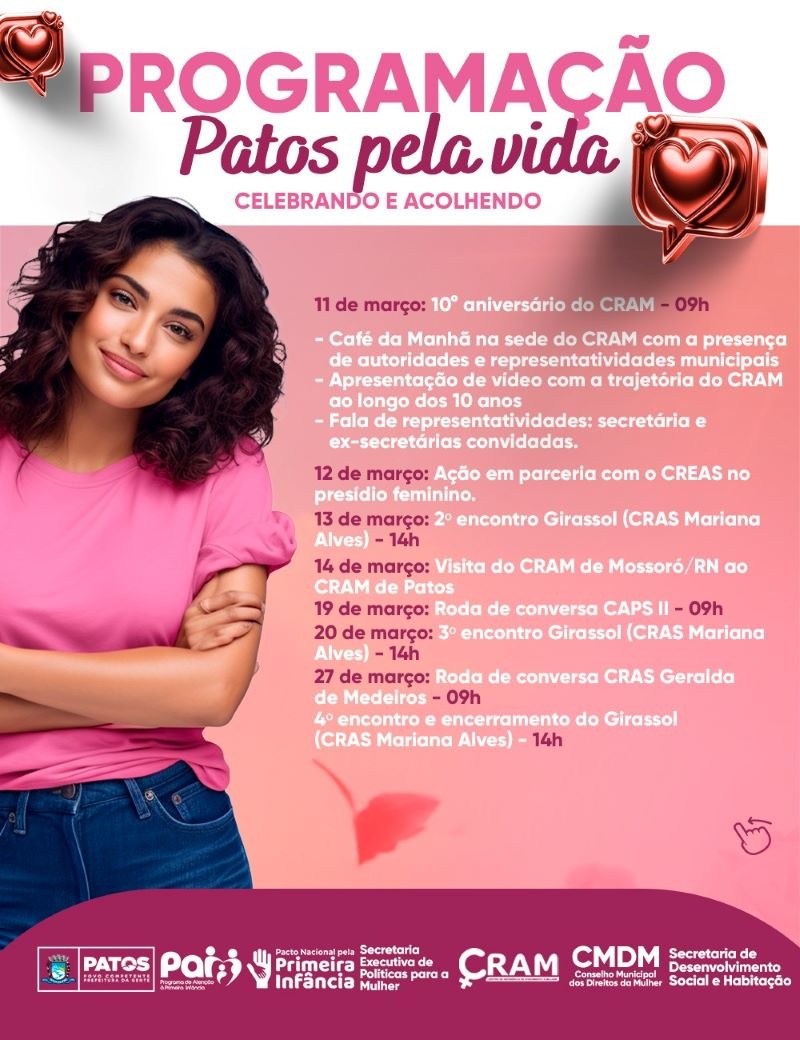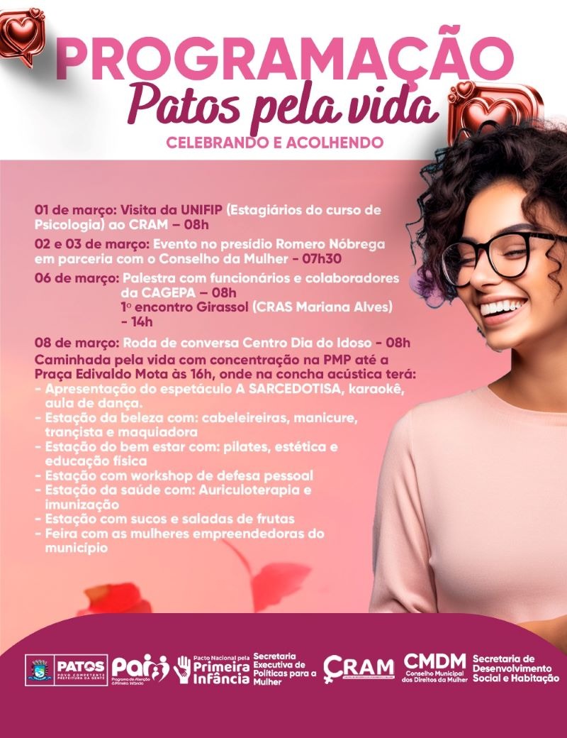 A Prefeitura de Patos, por meio da Secretaria Municipal da Mulher e da Diversidade Humana em parceria com o CRAM e o Conselho Municipal dos Direitos da Mulher, irá realizar uma vasta programação alusiva ao Dia Internacional da Mulher, comemorado em 8 de março.