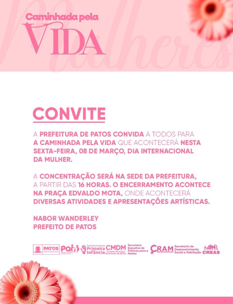 Em alusão ao Dia Internacional da Mulher, comemorado em 8 de março, a Prefeitura de Patos em parceria com o Conselho Municipal dos Direitos da Mulher realiza nesta sexta-feira, 8, a tradicional caminhada das mulheres, ‘A Caminhada pela Vida’. A concentração acontecerá na sede da prefeitura, a partir das 16 horas.
