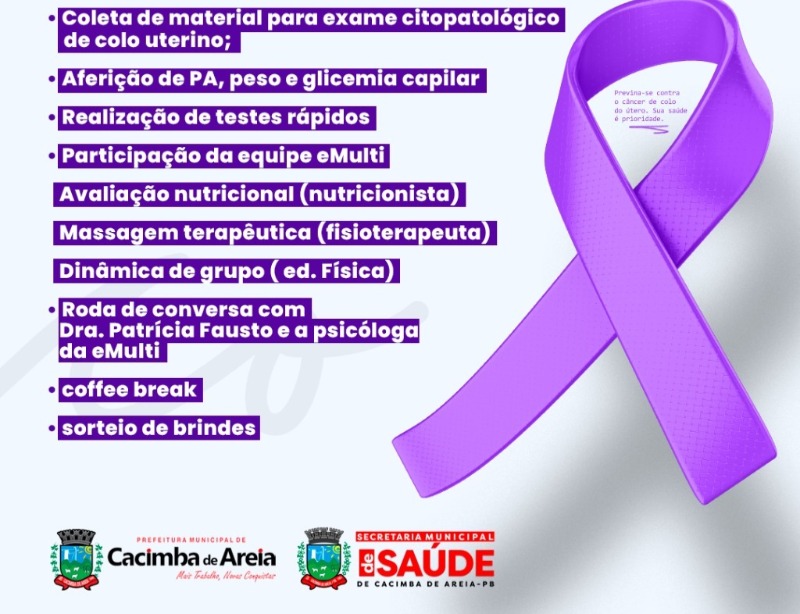No mês é de prevenção ao câncer do colo do útero a prefeitura de Cacimba de Areia, na Região Metropolitana de Patos, através da Secretaria Municipal de Saúde, tem programação destinada a levar a mensagem para mulheres, de que a prevenção é um dos principais fatores para se evitar contrair esse mal que é o 2° colocado em número de mortes por doenças femininas.
