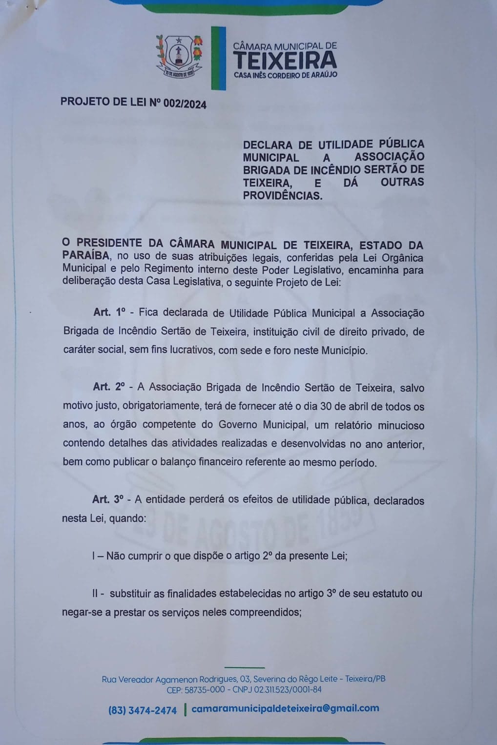 Em sessão ordinária realizada nesta sexta-feira, 15/03, na Câmara de Vereadores de Teixeira “Casa Inês Cordeiro de Araújo”, foi aprovado por unanimidade o Projeto Lei nº 002/2024, que declara de utilidade pública municipal, a Associação Brigada de Incêndio Sertão de Teixeira, na Região Metropolitana de Patos.