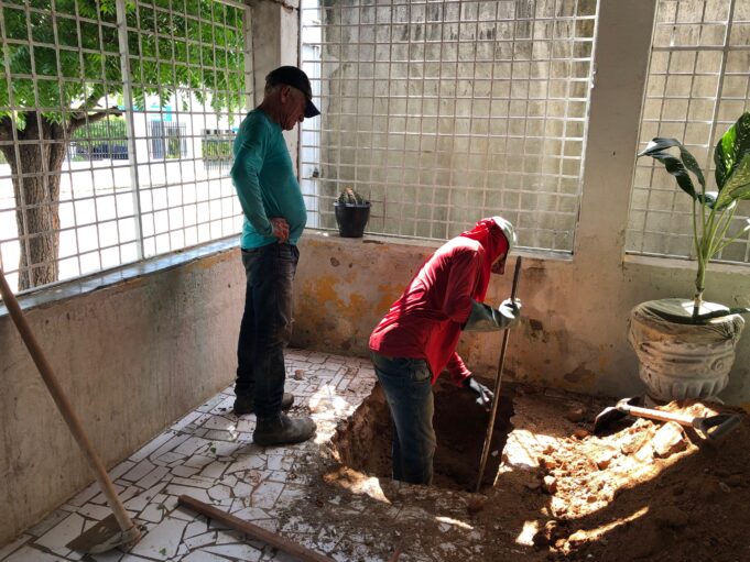 Ao realizar visita técnica, a equipe da Secretaria avaliou que seria necessário realizar a escavação para desobstrução no interior de uma residência, que foi prontamente aceita pelo proprietário, haja vista que a ação seria necessária para sanar o problema.