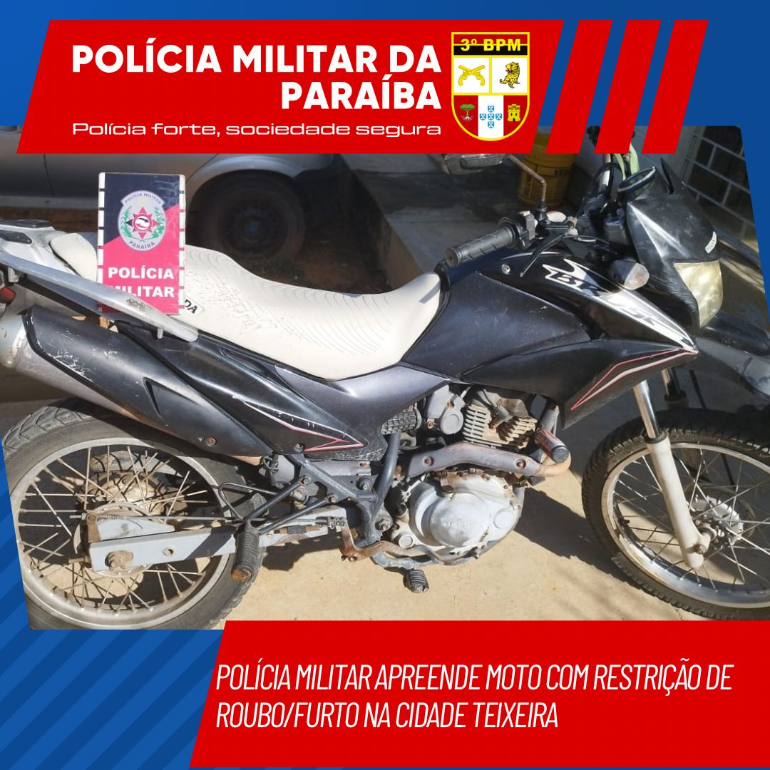 Na tarde desta quarta-feira, 20/03, a guarnição da Rádio-Patrulha realizava o patrulhamento ostensivo e preventivo na cidade de Teixeira, quando fez a consulta de uma motocicleta que estava parada em uma oficina mecânica da cidade. Ao consultar a placa, notou-se a placa original era do mercosul e a que estava na moto não era.