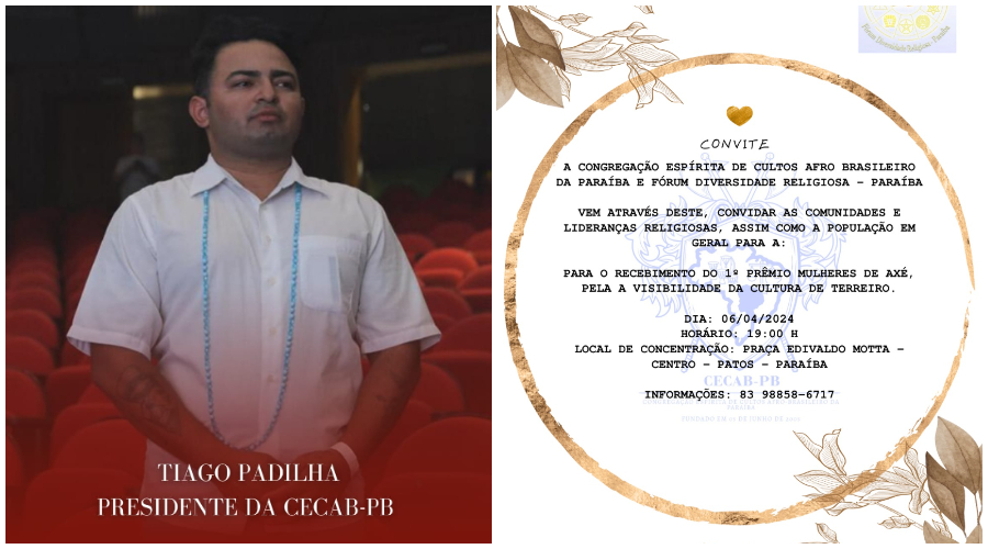 O presidente das religiões de matrizes africanas de Patos, Tiago Padilha, em nome da Congregação Espírita de Cultos Afro-Brasileiros da Paraíba, informou que a partir das 19h do sábado, 06/04, acontecerá a entrega do 1º Prêmio Mulheres do Axé na Praça Edivaldo Motta, no centro da cidade. Este evento visa homenagear pessoas, coletivos e personalidades participantes de religiões afro-brasileiras pelos seus trabalhos no combate ao racismo e à intolerância religiosa. Ao todo, trinta iniciativas foram reconhecidas.