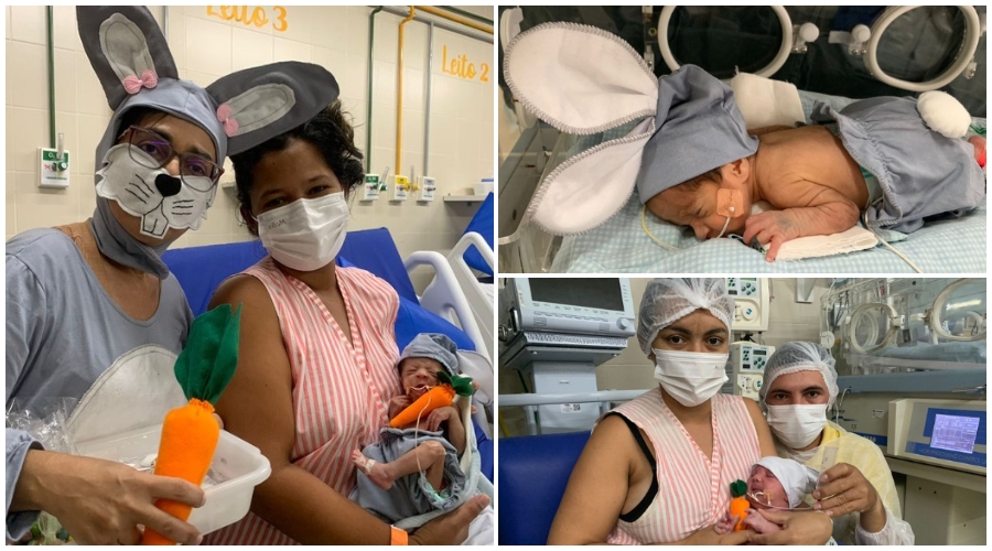 Além dos bebês, a equipe também entrou na brincadeira e, com fantasia de coelhinho da Páscoa, a técnica de enfermagem Cristina Nery, que também foi responsável por confeccionar os adereços, distribuiu lembrancinhas para as famílias que acompanham os pequenos durante o tratamento.
