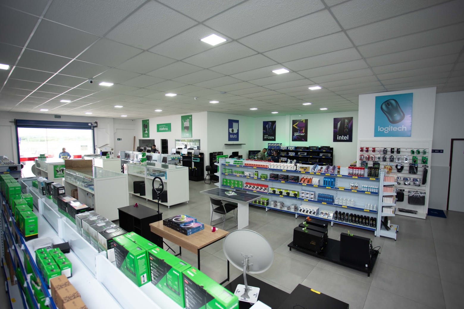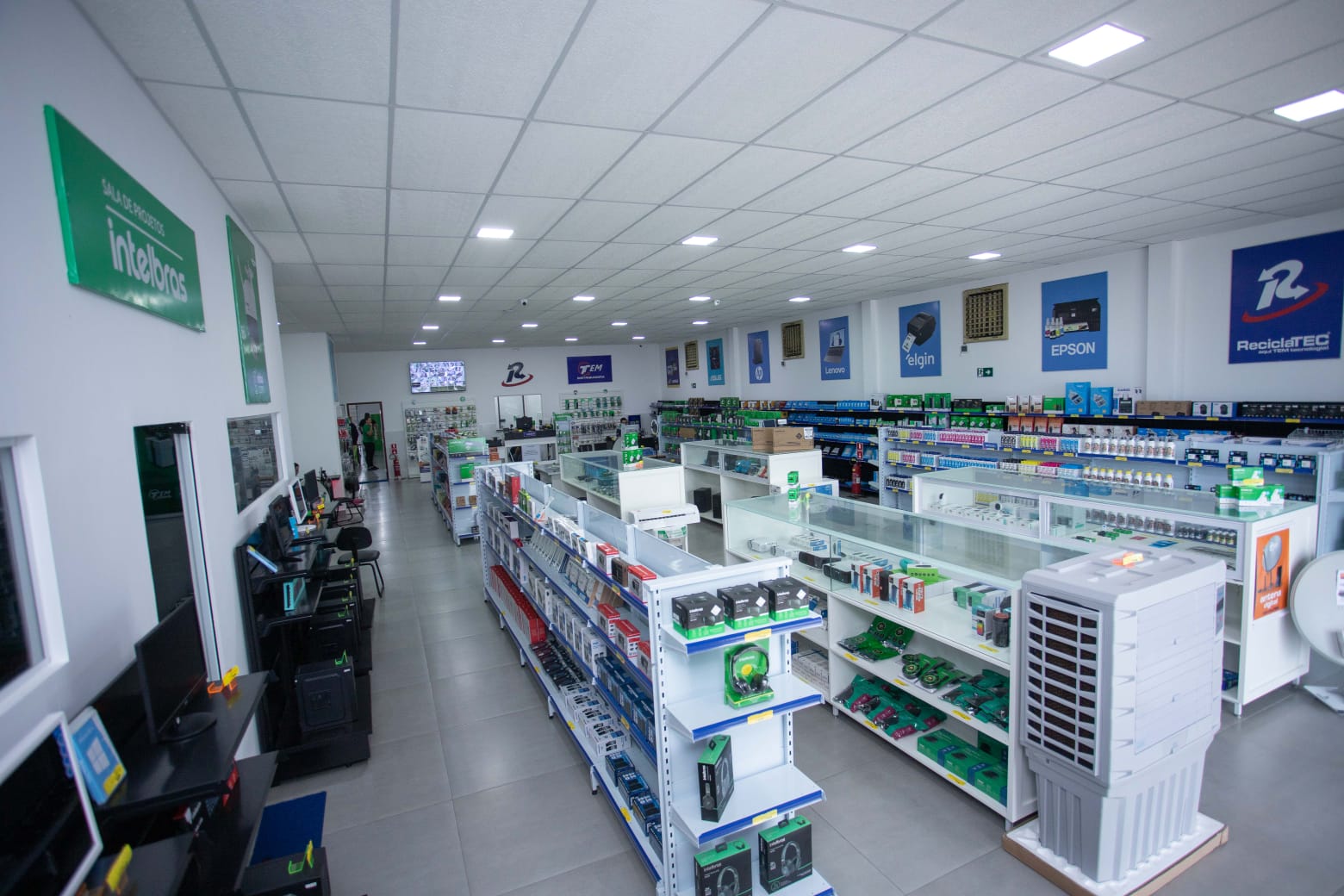 Paulino: Então, a ReciclaTEC que agora é TEM Informática e TEM Distribuidora, a gente oferece muitos produtos da parte de tecnologia. De um mouse a um super computador, na configuração que o cliente precisa, a gente monta aqui. E tem uma gama de produtos tecnológicos, como câmeras de segurança, computadores, impressoras e, hoje, um dos produtos que nós estamos investindo é a nova antena parabólica que vai substituir a antiga.