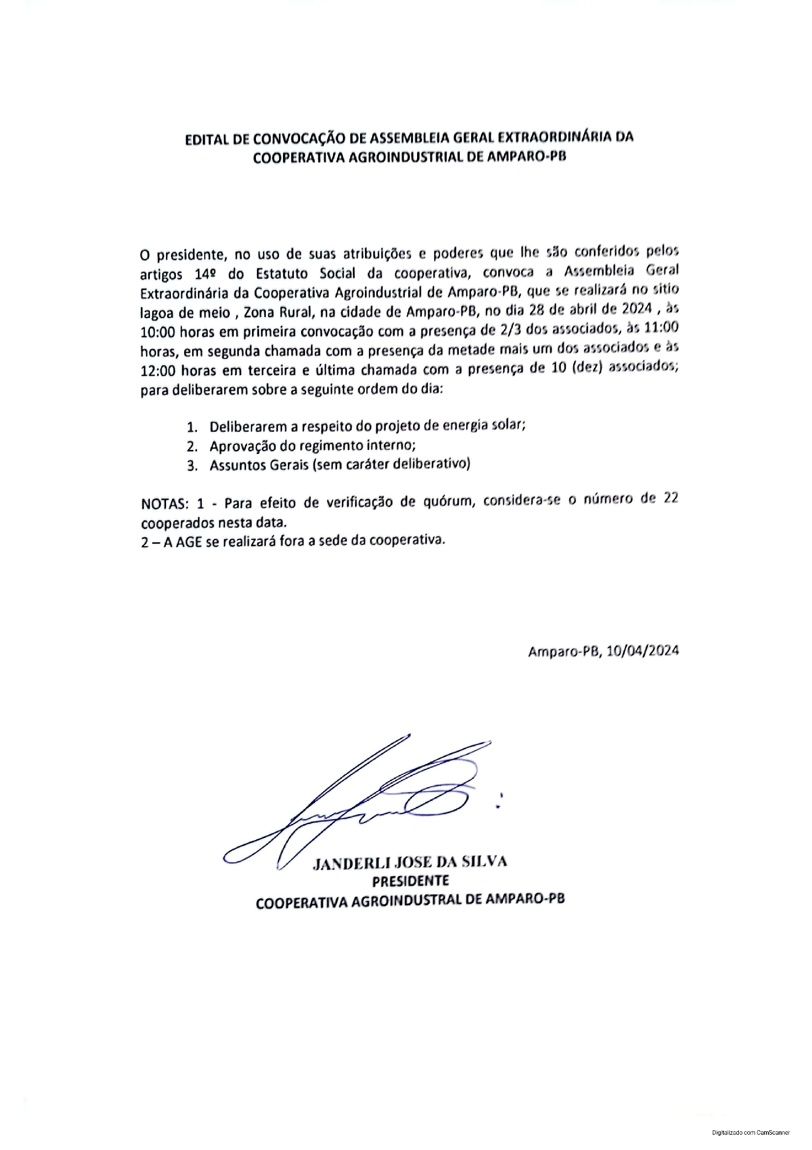 Início Gerais EDITAL DE CONVOCAÇÃO DE ASSEMBLEIA GERAL EXTRAORDINÁRIA DA COOPERATIVA AGROINDUSTRIAL DE AMPARO-PB EDITAL DE CONVOCAÇÃO DE ASSEMBLEIA GERAL EXTRAORDINÁRIA DA COOPERATIVA AGROINDUSTRIAL DE AMPARO-PB 10/04/2024 ... 09:00h FacebookWhatsAppPrintCopy URL Edital: clique na imagem para ampliar. Veja o edital em PDF. LEIA MAISÚltimas notícias Gerais Homem amputa as duas pernas em acidente com roçadeira em São Miguel de Taipu Gerais Paraíba tem 236 vagas abertas em concursos com salários de mais de R$ 20 mil Gerais Paraíba registra em média 26 afastamentos diários do trabalho por transtornos mentais