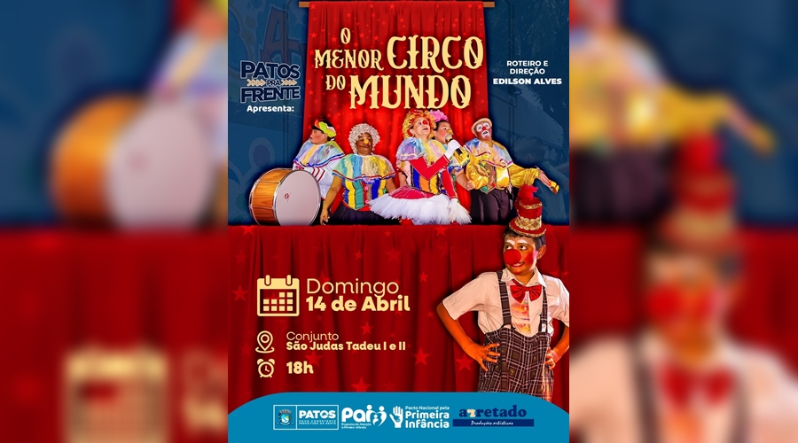 Inserido na programação do Patos Pra Frente, promovido pela Prefeitura de Patos por meio da Secretaria de Desenvolvimento Social e Habitação, chega ao município o espetáculo “O Menor Circo do Mundo”, destinado às famílias referenciadas pelo CRAS Geralda Medeiros, inseridas no CadÚnico.