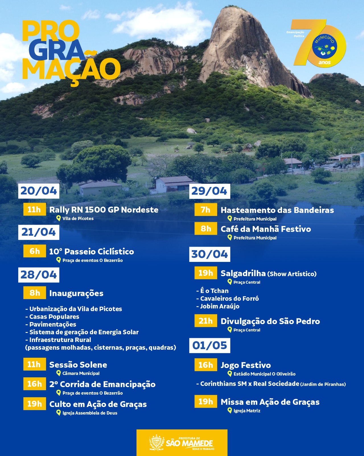 Saiu a programação alusiva aos 70 anos de emancipação política de São Mamede, na Região Metropolitana de Patos, nesta terça-feira, 16 de abril. A Prefeitura Municipal, por meio do prefeito Dr. Jefferson, convida a população em geral a prestigiar as atividades elencadas no banner.