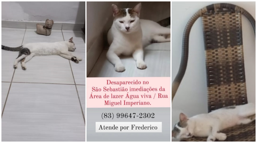 A senhora Sara Dayanne Estevam Felipe e sua família estão procurando seu gato de estimação, um mestiço que atende pelo de Frederico. O animal desapareceu na Rua Miguel Imperiano, nas imediaçôes da área de lazer Água Viva, no bairro São Sebastião, em Patos, desde a segunda-feira, 13/05.