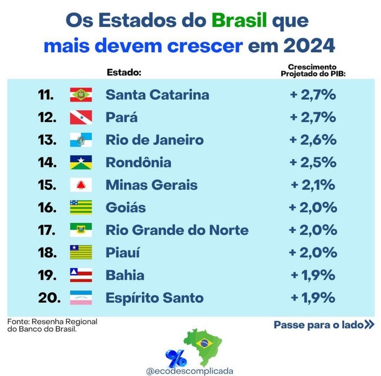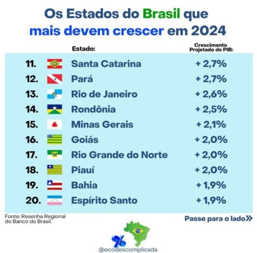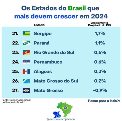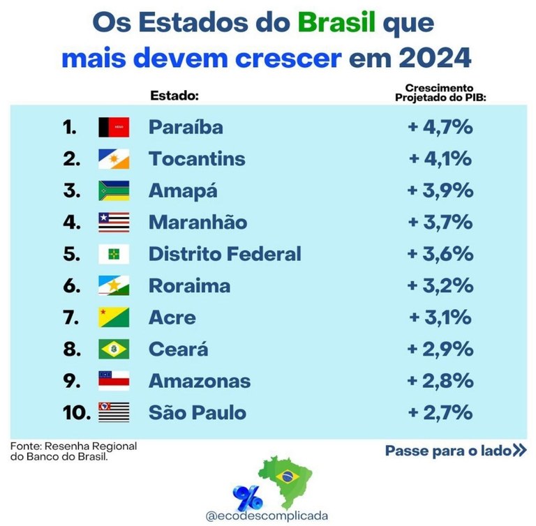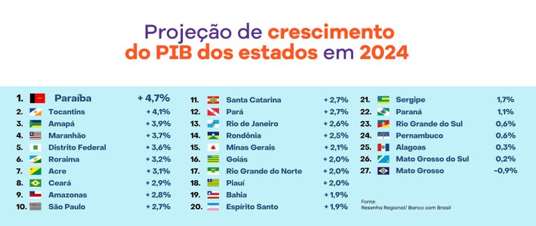 No ranking das projeções com os maiores crescimentos econômicos para o ano de 2024 estão, além da Paraíba (4,7%), os Estados de Tocantins (4,1%), Amapá (3,9%), Maranhão (3,7%) e o Distrito Federal (3,6%). Já o Mato Grosso é o único Estado com previsão de queda no PIB (-0,9%).