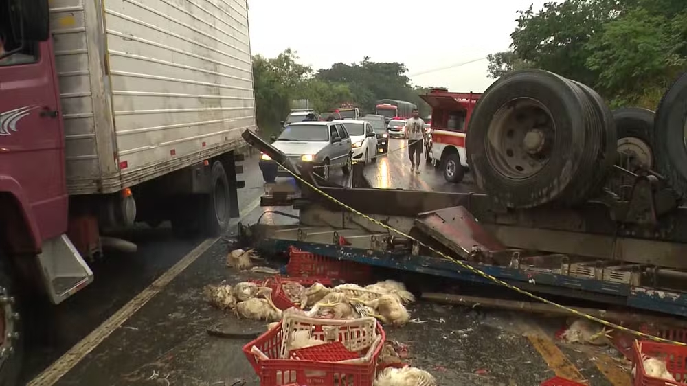 O motorista de um dos caminhões, que estava carregado com frango, fez uma curva fechada e acabou perdendo o controle do veículo, que bateu numa mureta, capotou e invadiu a via oposta.