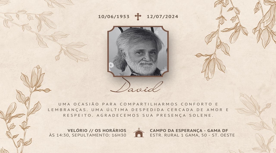 Morreu por volta das 13h de ontem (sábado, 12/07), no Hospital Daher, em Brasília, o senhor David Adjuto Leite, de 71 anos.