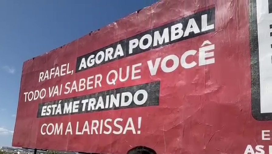 Na ‘peça publicitária’ está escrito um recado simples e direto: “Rafael, agora Pombal todo vai saber que você está me traindo com Larissa!”.