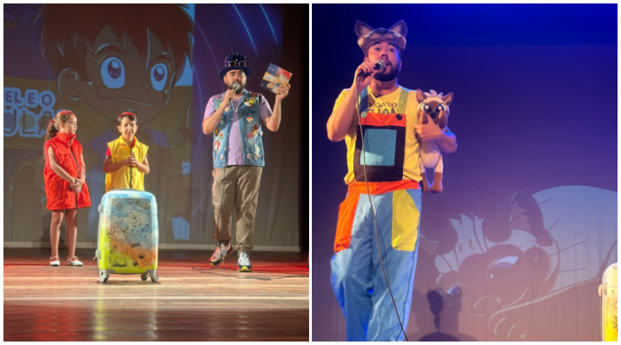 Junior Misaki, natural da cidade de Patos, conhecido por suas obras encantadoras como “O Gato Juan”, “Miguel e o Celular” e “Clarice e a Andorinha”, trouxe à vida suas histórias de maneira envolvente e interativa. O espetáculo contou com brincadeiras, músicas e uma performance vibrante, garantindo momentos de pura alegria e emoção para todos os presentes.