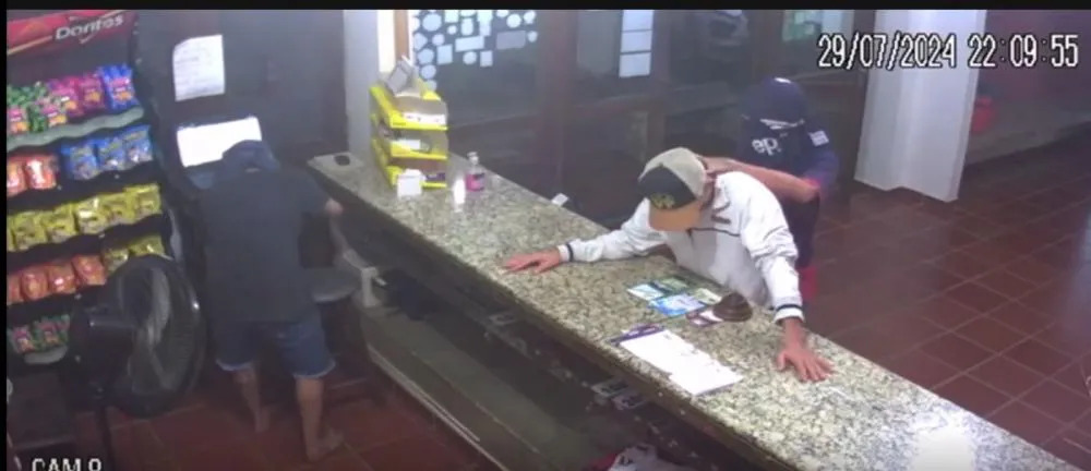 Nas imagens, após adentrarem o local, um dos assaltantes pulou o balcão da recepção e vasculhou o caixa, levando dinheiro e outros pertences. Enquanto isso, o segundo assaltante roubou a carteira do vigilante. Toda a ação foi rápida e durou apenas alguns minutos.