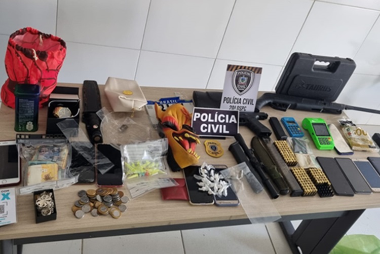 Durante as ações foram apreendidos uma pistola, uma espingarda, grande quantidade de munições, substâncias ilícitas, aparelhos celulares, câmeras de monitoramento e numerários.
