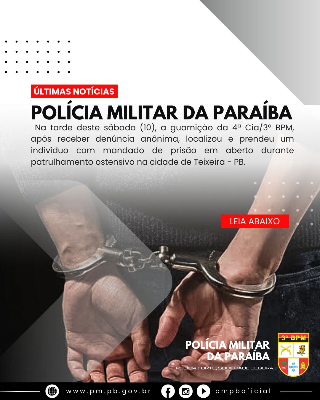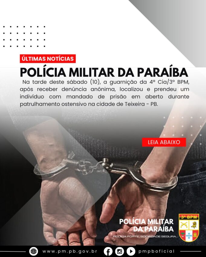 Na tarde deste sábado, 10 de agosto, por volta das 16h20min, durante o patrulhamento ostensivo na cidade de Teixeira, na Região Metropolitana de Patos, mais precisamente no bairro Vila Feliz, a guarnição da 4ª Cia/3º BPM recebeu uma denúncia anônima sobre a presença de um indivíduo com mandado de prisão em aberto.