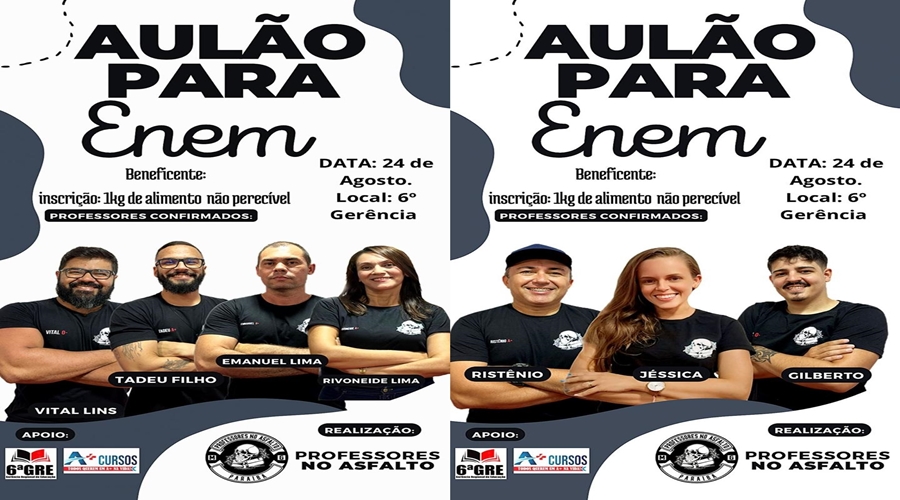 O aulão tem uma dupla função: ajudar os alunos do Ensino Médio que irão realizar o Enem 2024 e arrecadar alimentos não perecíveis para serem doados a pessoas que estão necessitando de ajuda. Portanto, o nosso motogrupo conta com a participação de todos os estudantes da cidade de Patos e região.