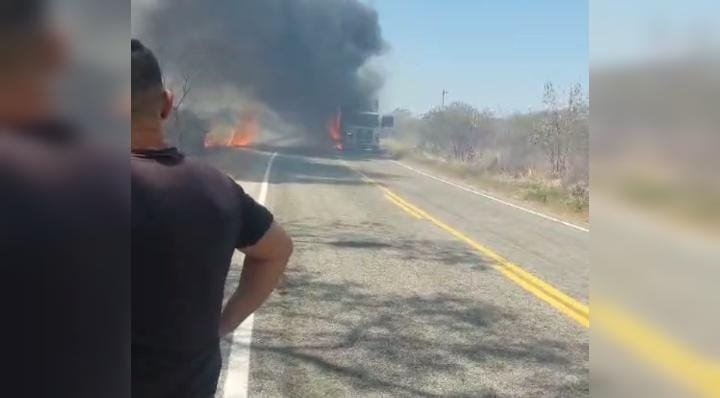 Um caminhão carregado de frango pegou fogo após entrar em contato com as chamas de um incêndio as margens da pista que liga Itaporanga a Pedra Branca, no Vale do Piancó, na manhã desta terça-feira (3).