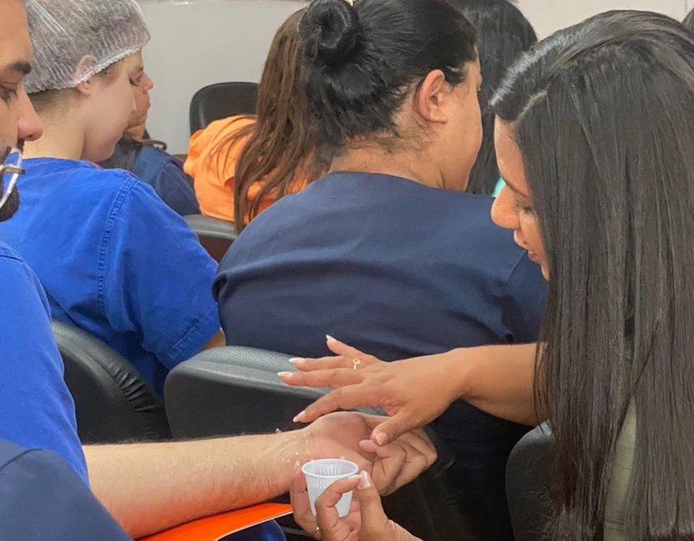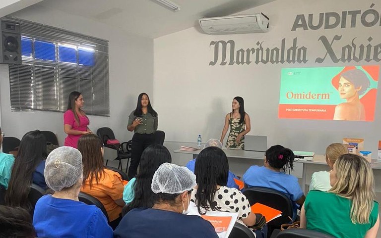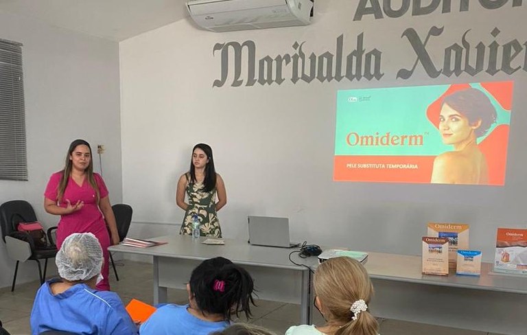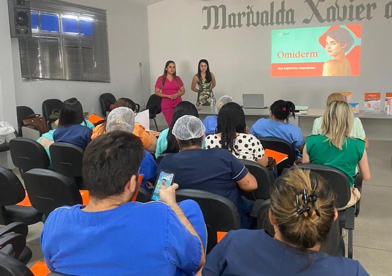 O treinamento desta terça-feira, ministrado pela enfermeira Júlia Buonafina, que tem especialidade em Clínica Médica e Cirúrgica e é pós-graduada em Dermatologia Estética e especialista em pressão negativa, foi sobre uma pele substituta temporária denominada ‘Película Omiderm’. Essa película é indicada em diversos casos de lesão cutânea, a exemplo de queimaduras de primeiro e segundo grau, lesões por pressão, úlcera vascular e síndrome de Stevens-Johnson (SSJ).