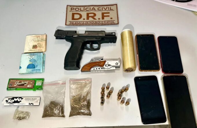 Durante a ação, um jovem de 19 anos foi preso em flagrante com uma arma de fogo, munições, uma quantidade significativa de maconha e outros itens. Ao perceber a aproximação policial, o suspeito tentou fugir pulando o muro de sua residência, mas foi rapidamente contido pela equipe.