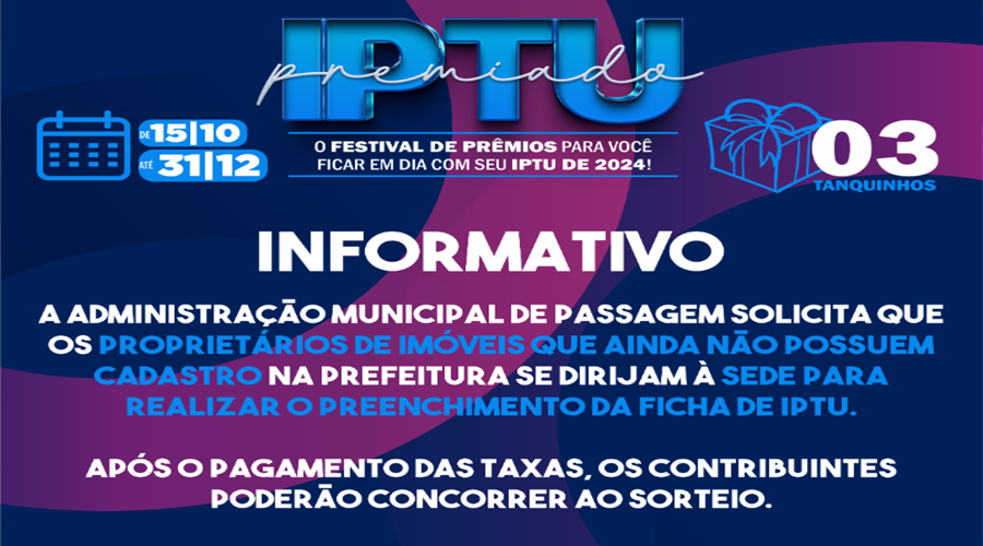 A Administração Municipal de Passagem informa aos proprietários de imóveis que ainda não possuem cadastro na prefeitura que devem comparecer à sede para realizar o preenchimento da ficha do IPTU.