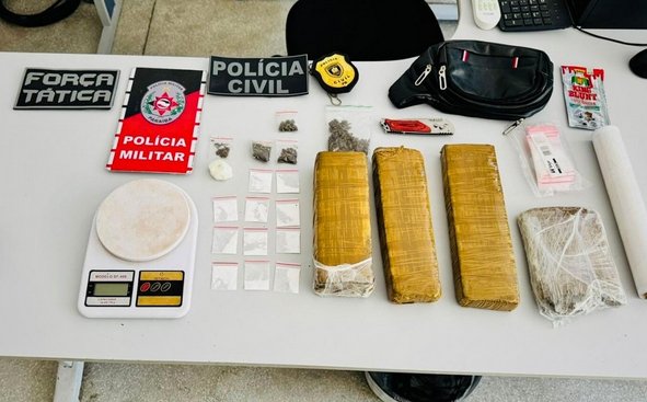 Na residência, foram apreendidos 2,3 kg de substância semelhante à maconha, cerca de 20 g de substância análoga à cocaína, uma balança de precisão e materiais utilizados para embalar drogas.
