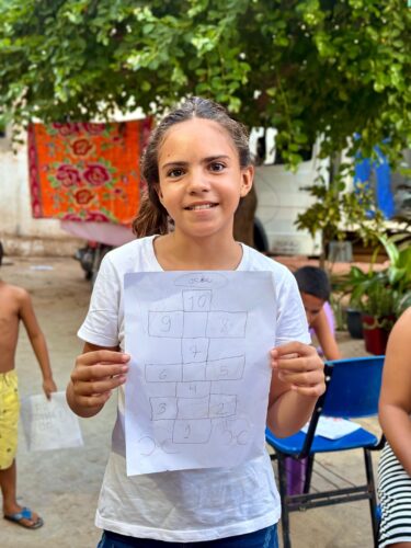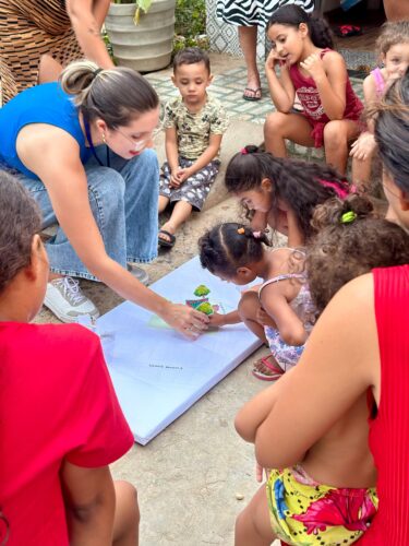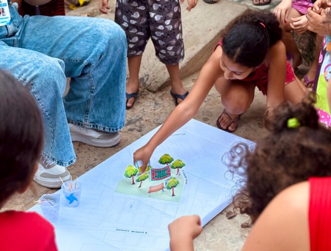 O encontro aconteceu no próprio bairro e envolveu crianças que estavam brincando na localidade. Uma maquete com o mapa da área foi apresentada, e as crianças puderam escolher elementos que consideram importantes para a nova praça, como árvores, bancos, brinquedos (balanços, gangorras e escorregadores), lixeiras e até um espaço com equipamentos de ginástica para as famílias. Em seguida, foram incentivadas a expressar suas ideias por meio de desenhos, oferecendo à SEPLAN inspirações para compor o projeto final.