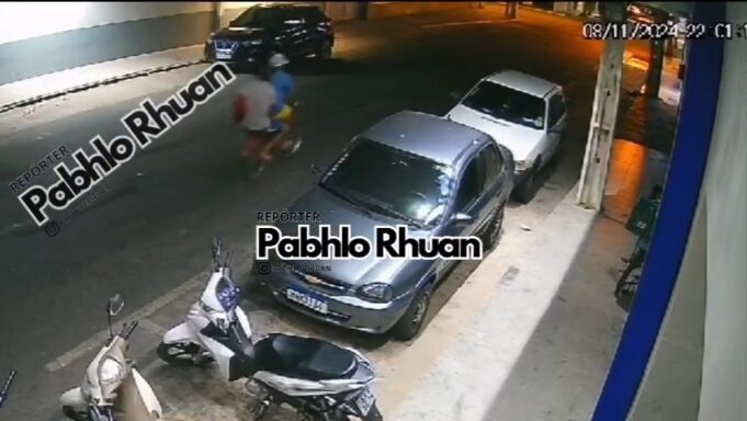 Câmeras de segurança registraram o momento em que os suspeitos chegaram em uma bicicleta com bagageiro. Um deles desceu, abordou a vítima que estava prestes a entrar em seu apartamento e, armado com uma faca, a ameaçou para roubar o aparelho.