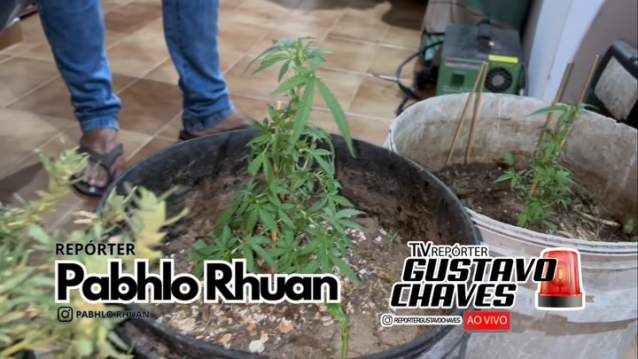 No local indicado, foram encontrados três pés de maconha já plantados, além de materiais típicos do tráfico de drogas, como rolos de plástico filme, balanças de precisão, baldes com água e um sofá utilizado pelos suspeitos. As plantas haviam acabado de ser regadas, mas os acusados não foram localizados no momento da ação.