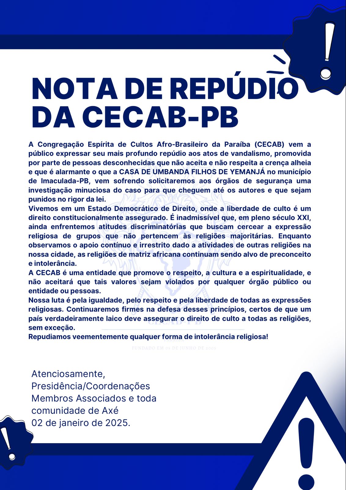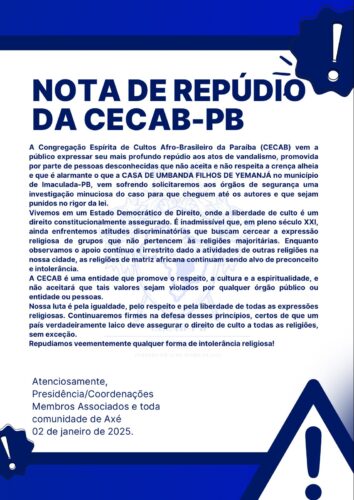 A CECAB-PB lamenta o fato e deixa sua nota de repúdio.
