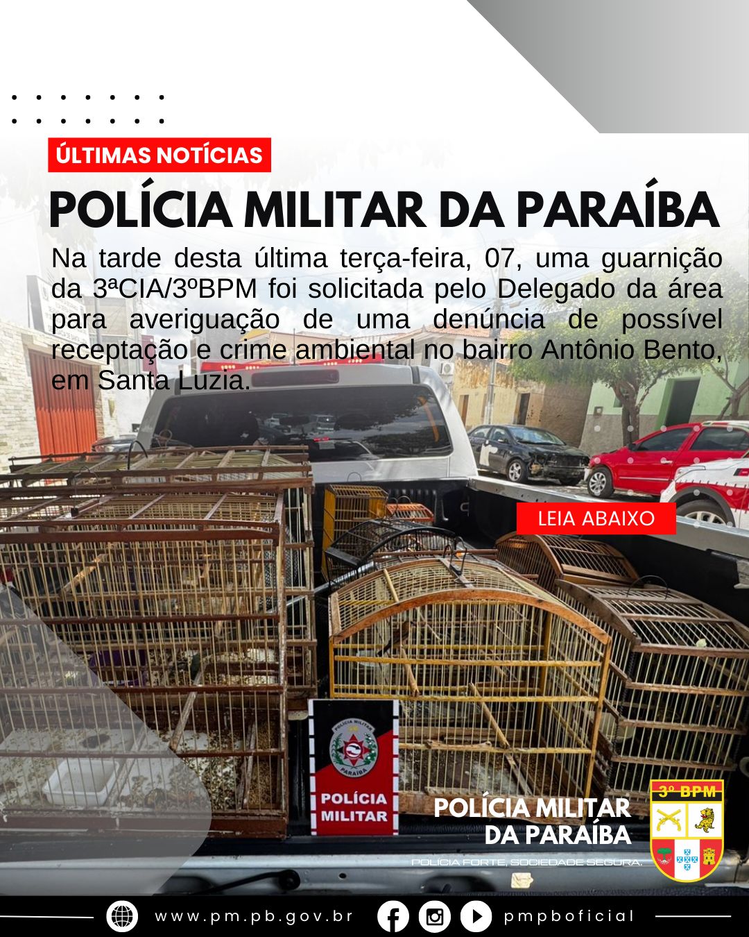 Na tarde desta última terça-feira, 07, uma guarnição da 3ª Cia/3º BPM foi solicitada pelo delegado da área para averiguação de uma denúncia de possível receptação e crime ambiental no bairro Antônio Bento, em Santa Luzia, na Região Metropolitana de Patos.
