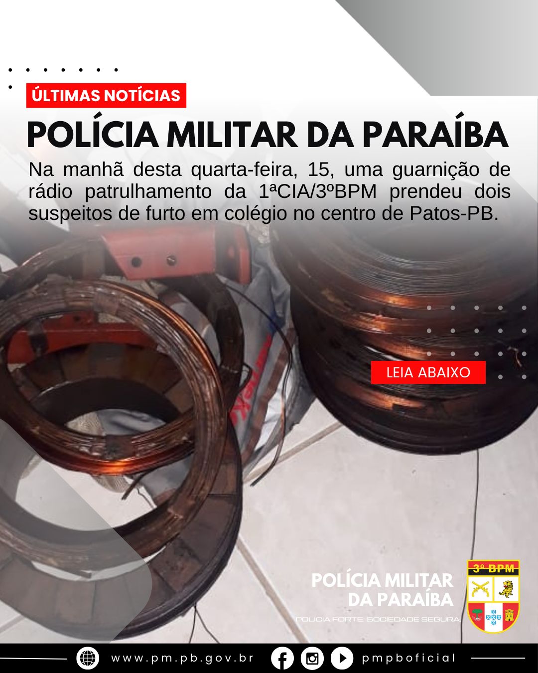 Na manhã desta quarta-feira, 15, uma guarnição de rádio patrulhamento da 1ª Cia/3º BPM prendeu dois suspeitos de cometerem furto em colégio no centro de Patos.