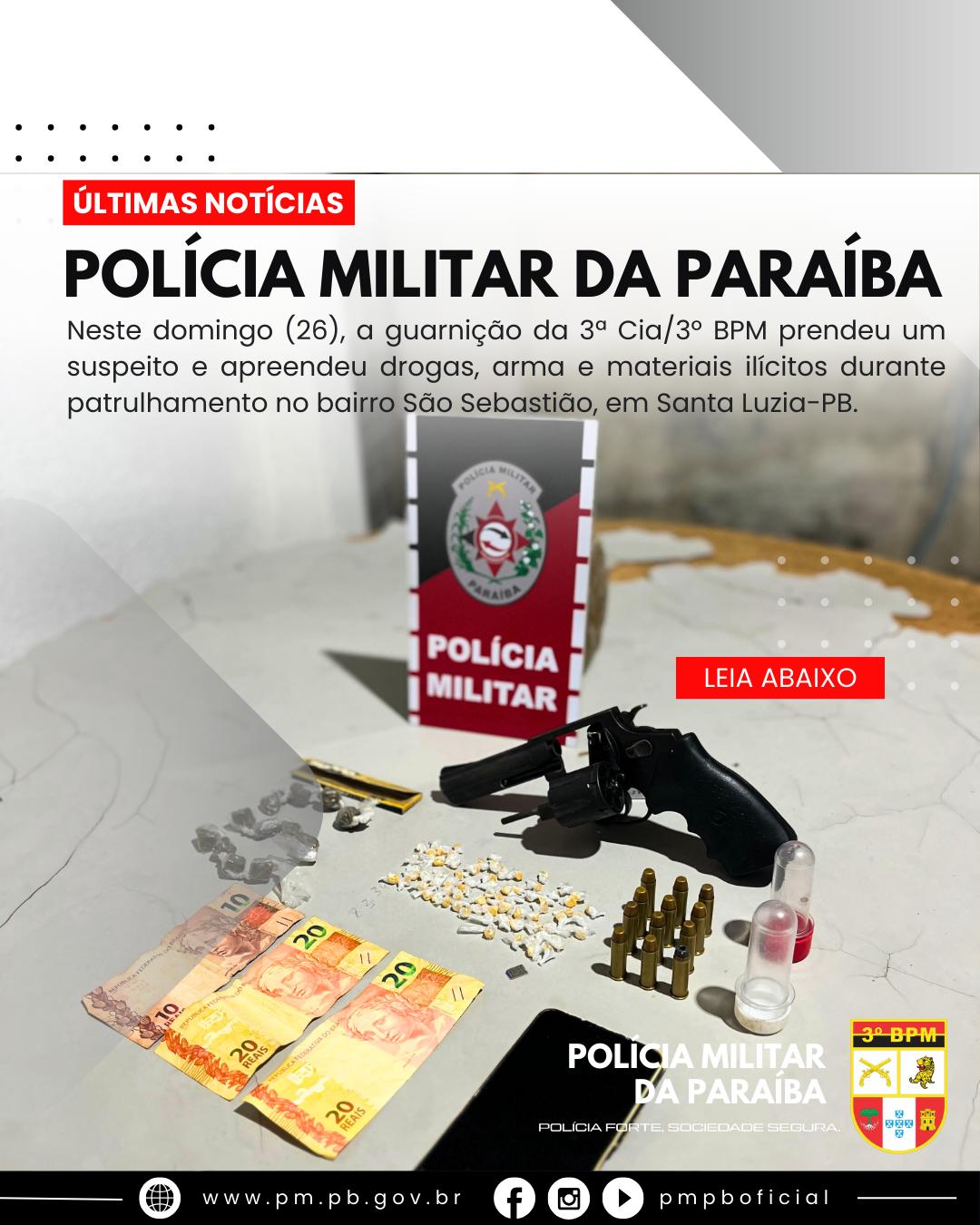 Na tarde deste domingo, 26 de janeiro, por volta das 16h30, a guarnição da 3ª Cia/3º BPM realizou a prisão de um suspeito e a apreensão de materiais ilícitos durante patrulhamento de rotina no bairro São Sebastião, conhecido popularmente como Monte, em Santa Luzia, na Região Metropolitana de Patos.