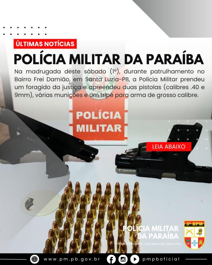 Na tarde desta sexta-feira, 31 de janeiro, por volta das 17h, as guarnições da 3ª Cia/3º BPM, realizavam patrulhamento no Bairro Frei Damião, em Santa Luzia, na Região Metropolitana de Patos, que resultou na prisão de um foragido da justiça, além da apreensão de duas pistolas, calibres .40 e 9mm, várias munições e um tripé para arma de grosso calibre.
