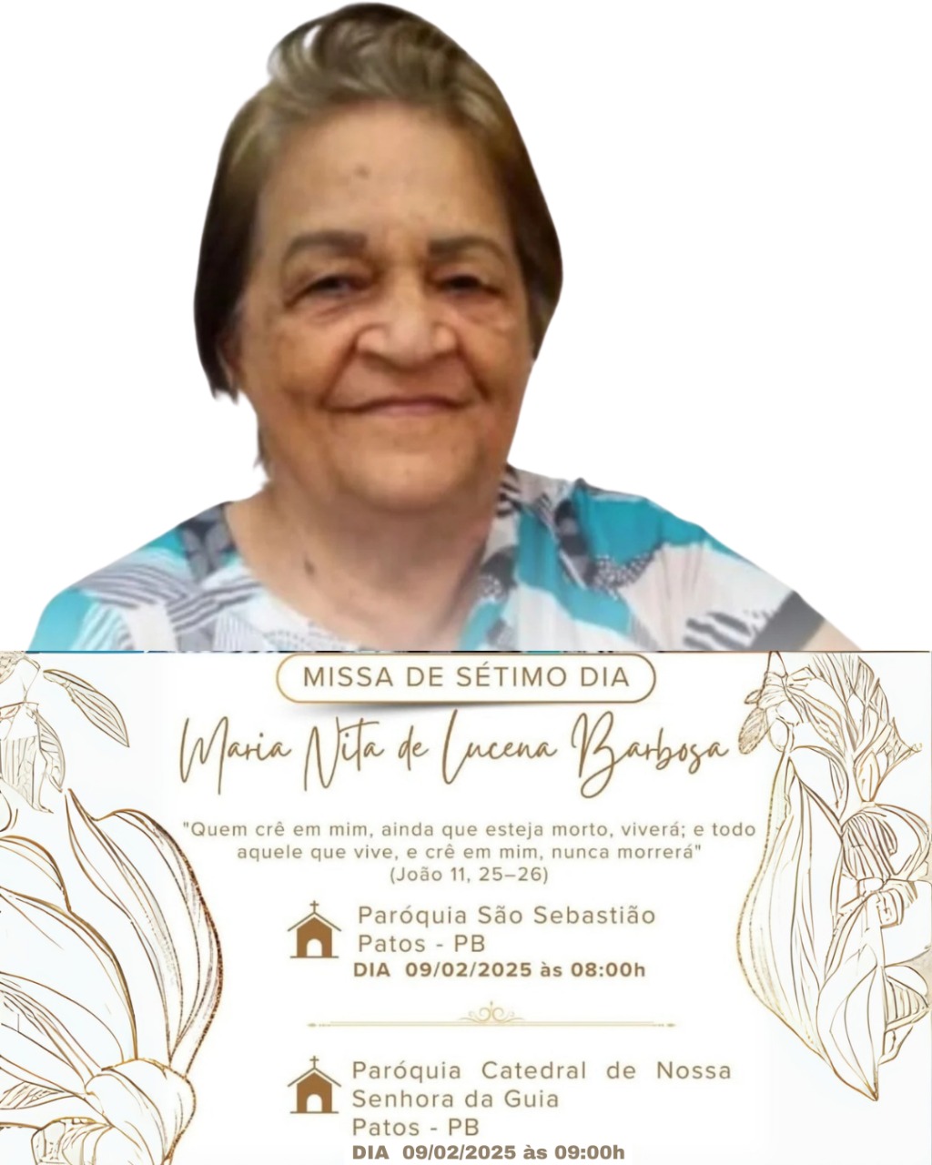 A família de Maria Nita de Lucena Barbosa comunica que será neste domingo, dia 9 de fevereiro, a missa de 7º Dia de sua memória.