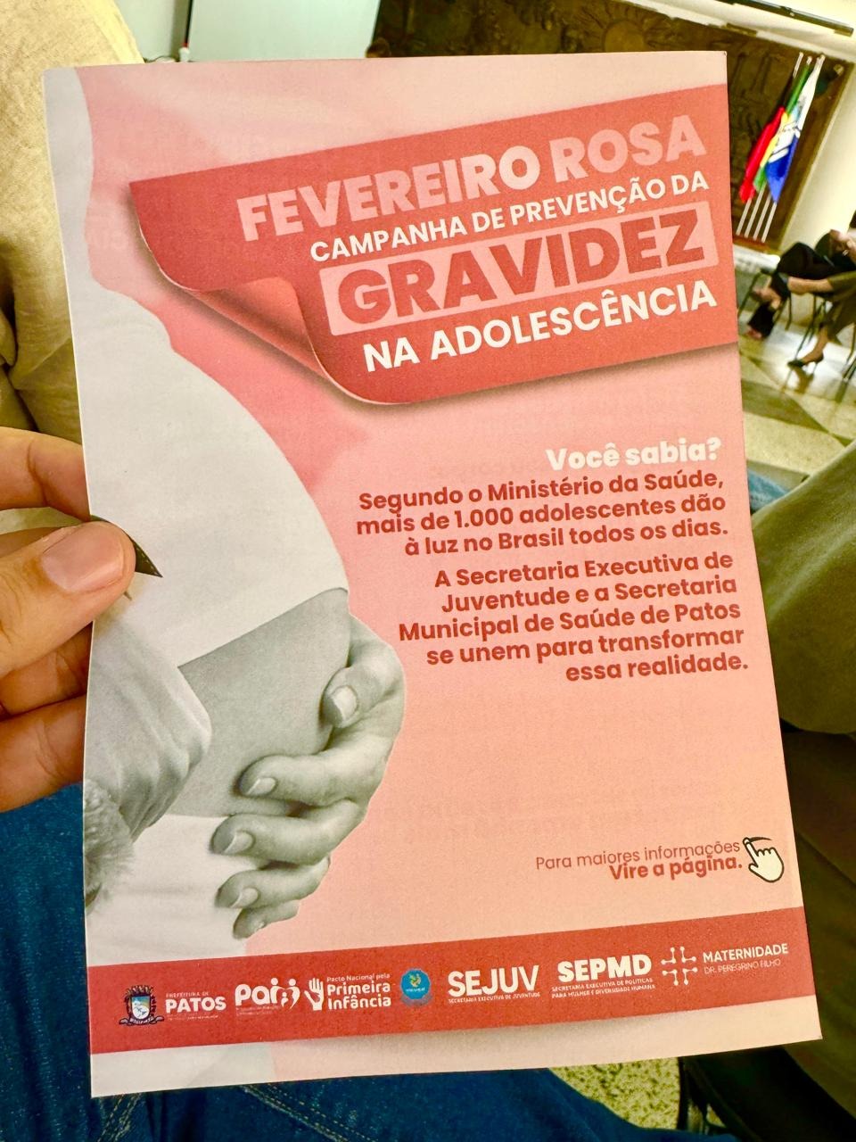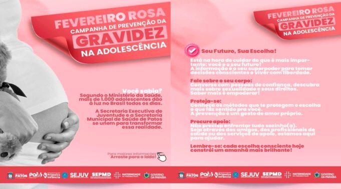 A Prefeitura de Patos, por meio da Secretaria Executiva de Juventude, em parceria com a Secretaria Municipal de Saúde e com o apoio da Maternidade Peregrino Filho, está com a campanha Fevereiro Rosa. A iniciativa visa conscientizar os jovens sobre os riscos e as consequências da gravidez na adolescência, tema de grande relevância diante dos dados alarmantes do Ministério da Saúde, que apontam que mais de mil adolescentes dão à luz diariamente no país.