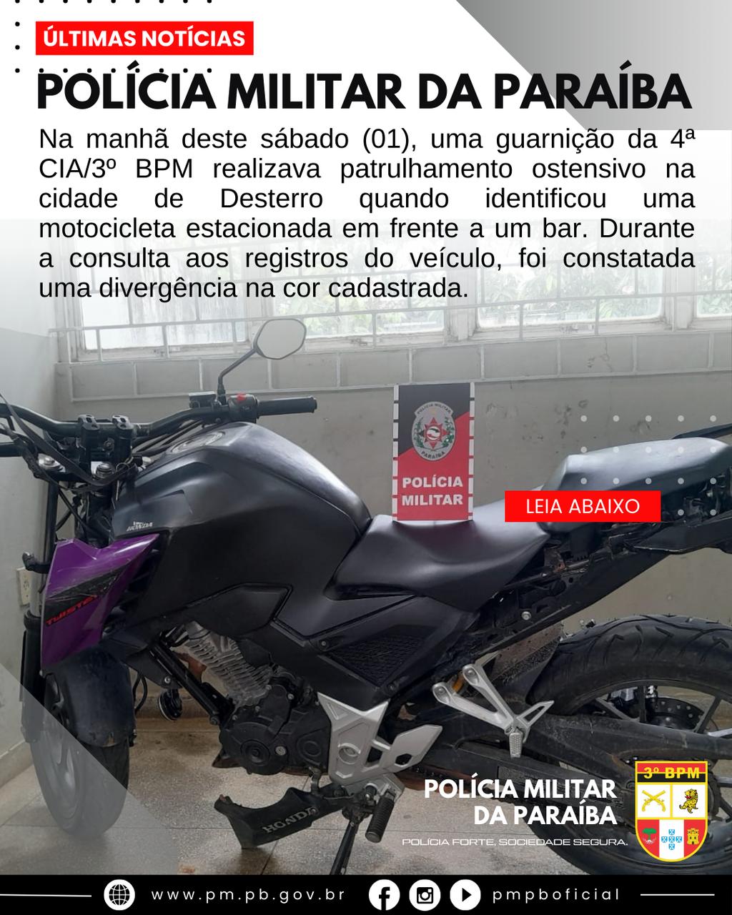Na manhã deste sábado (01), uma guarnição da 4ª CIA/3º BPM realizava patrulhamento ostensivo na cidade de Desterro, na Região Metropolitana de Patos quando identificou uma motocicleta estacionada em frente a um bar. Durante a consulta aos registros do veículo, foi constatada uma divergência na cor cadastrada.