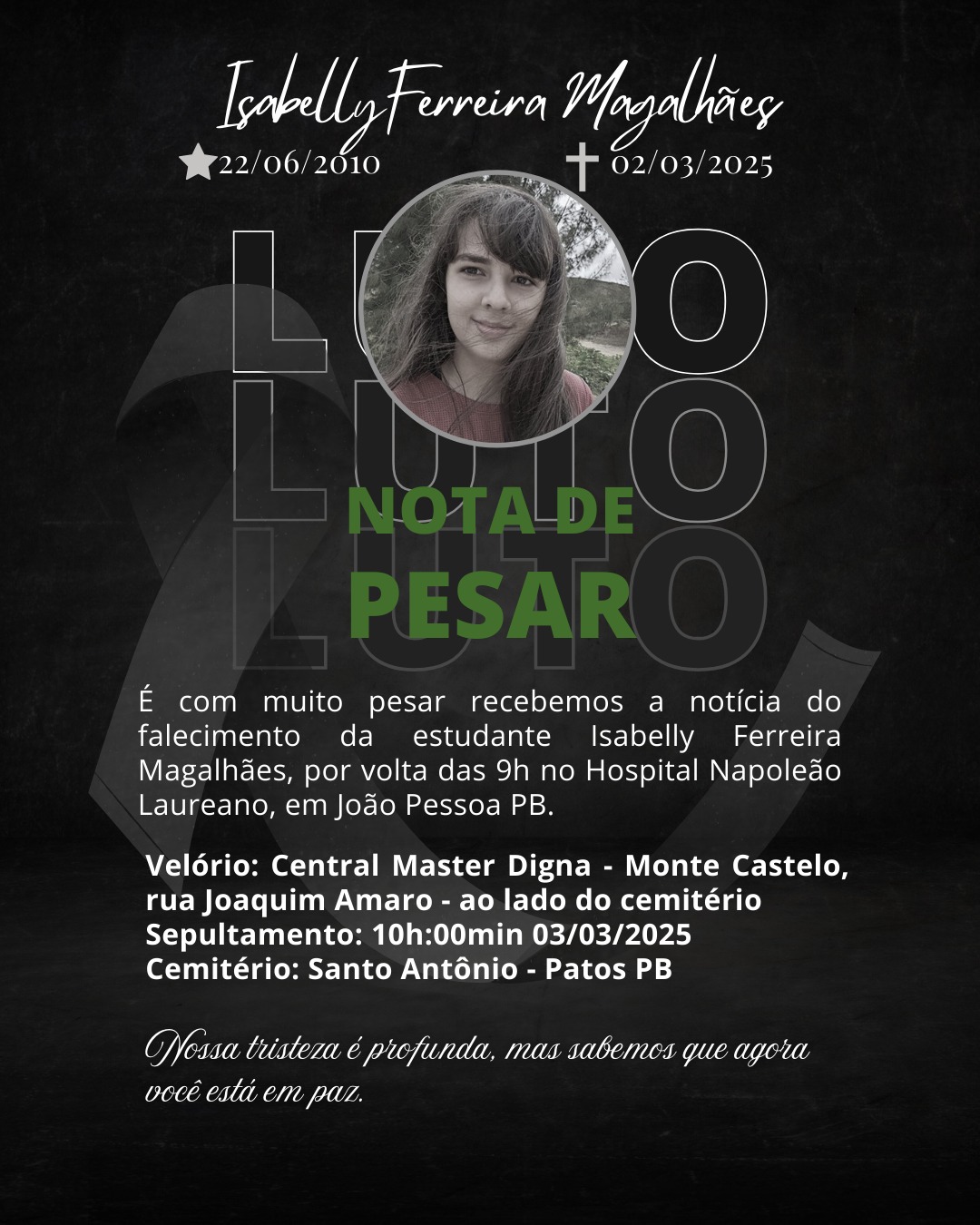 O corpo da adolescente Isabelly Ferreira Magalhães está previsto para chegar a Patos por volta das 20h deste domingo, 02/03, e será velado na Central de Velórios Master Digna, na Rua Joaquim Amaro, no Monte Castelo. O sepultamento será às 10h segunda-feira, 03, no Cemitério Santo Antônio, também no Monte Castelo.