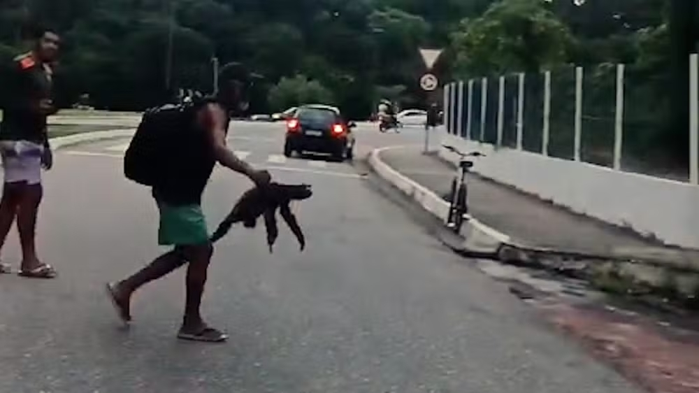 Um pedestre se prontificou a ajudar, pedindo para que os veículos parassem, enquanto outra pessoa, com o devido cuidado, pegou o animal pelas costas e o levou até a grade de proteção da universidade.