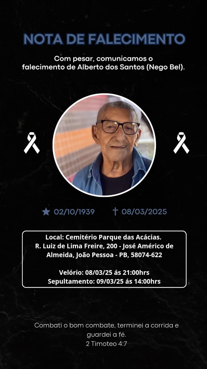 Morreu neste sábado, 08/03, de causas naturais, em João Pessoa, o aposentado Alberto dos Santos de 85 anos.