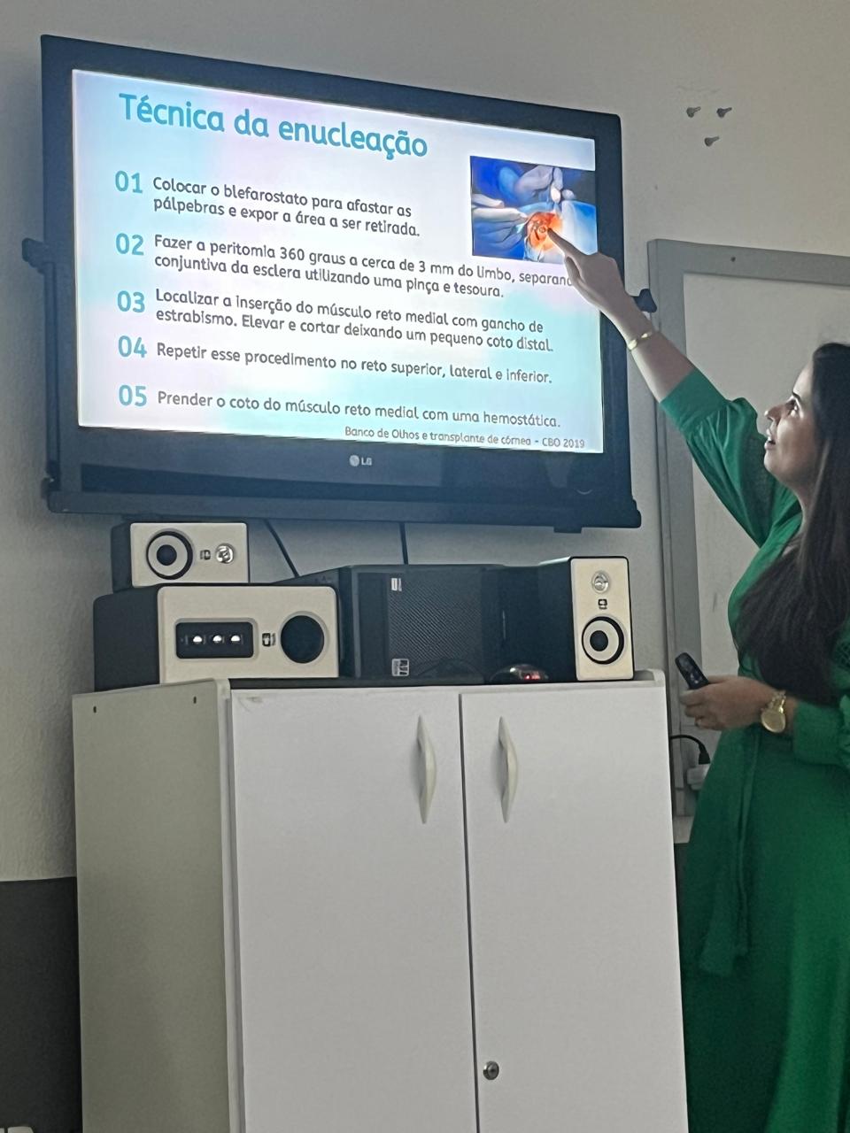 O treinamento foi dividido em teoria e prática, e foi acompanhado por oftalmologistas e enfermeiros enucleadores da Central Estadual de Transplante da Paraíba. O objetivo foi formar mais profissionais de saúde para captação de córneas, como relata Raelma. “Foi um momento de grande conhecimento, de formação de profissionais para ampliação de transplantes, e estou muito feliz de ter representado o Hospital de Patos e voltar com novos conhecimentos para nossa equipe, na certeza de que estamos nos preparando muito bem para tornar nossa unidade um centro de referência na captação de tecidos”, destaca. A capacitação foi conduzida pela oftalmologista Sarah Menezes e pelo médico intensivista, Thiago Catão.