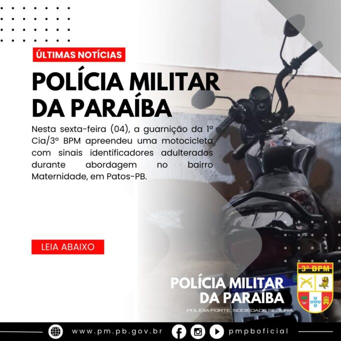 Na tarde desta sexta-feira, 04 de abril, durante patrulhamento no bairro Maternidade, em Patos, uma guarnição da 1ª Cia/3º BPM abordou uma motocicleta de cor preta após atitude suspeita nas proximidades da Rua Vereador Apolônio Gonçalves de Lima.