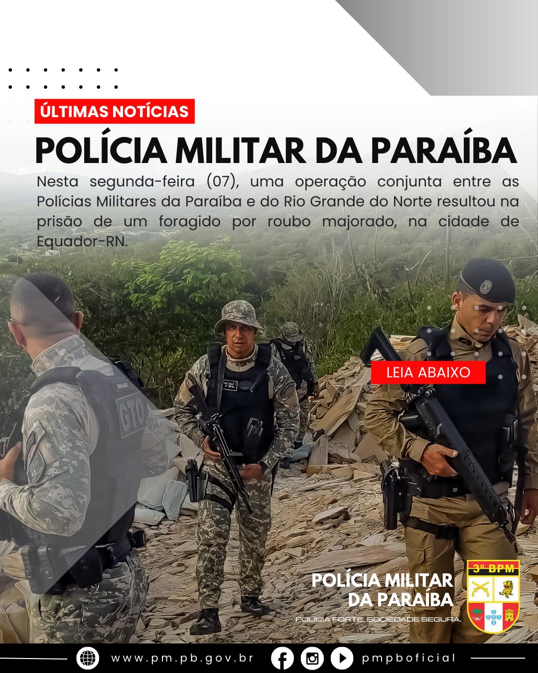 Na tarde desta segunda-feira, 7 de abril, foi realizada uma operação integrada entre a Polícia Militar da Paraíba, por meio da 3ª Cia/3º BPM (Santa Luzia-PB) e da 8ª CIPM (Juazeirinho-PB), e a Polícia Militar do Rio Grande do Norte, com o objetivo de cumprir mandado de prisão expedido pela Vara Única da Comarca de Santa Luzia-PB, relacionado ao crime tipificado no art. 157, §2º do Código Penal Brasileiro (roubo majorado).