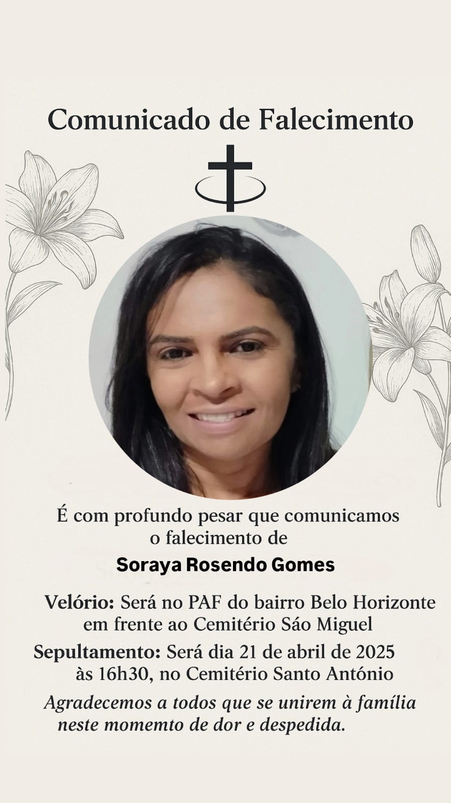 O velório da contabilista Soraya Rosendo Gomes está previsto para começar às 16h deste domingo, 20/04, na Central de Velórios PAF Master, na Rua Horácio Nóbrega, no Belo Horizonte, em Patos; e o sepultamento será às 16h30min desta segunda-feira, 21, no Cemitério Santo Antônio, no Monte Castelo, em Patos Ela tinha 51 anos e residia no bairro São Sebastião, em Patos.