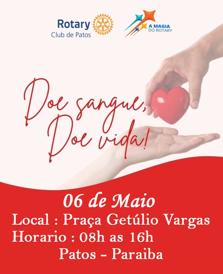 No dia 6 de maio, o Rotary Club de Patos realiza uma ação solidária de doação de sangue, das 8h às 16h, na Praça Getúlio Vargas, no centro da cidade. A campanha busca incentivar a população a contribuir com os estoques dos bancos de sangue do estado.