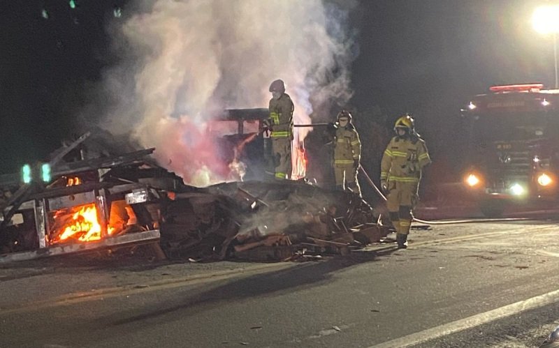 O veículo de passeio modelo Corsa, ficou completamente destruído pelas chamas. Foi identificada uma vítima fatal no interior do Corsa.