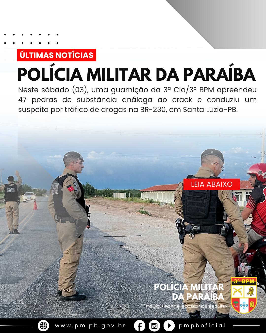 Na tarde deste sábado (03), por volta das 12h10, uma guarnição da 3ª Cia/3º BPM realizava rondas preventivas na BR-230, no município de Santa Luzia, na Região Metropolitana de Patos, quando flagrou um homem em atitude suspeita, aparentemente realizando a entrega de entorpecente a um possível usuário.