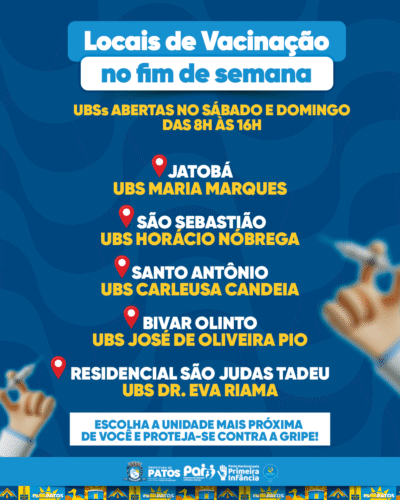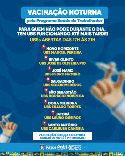 A Prefeitura de Patos, por meio da Secretaria Municipal de Saúde, está promovendo uma intensificação da campanha de vacinação contra a influenza (gripe), ampliando o acesso às doses por meio de atendimentos especiais aos finais de semana e em horários noturnos durante a semana. Vale lembrar que a vacinação está disponível para o público em geral a partir dos seis meses de idade.
